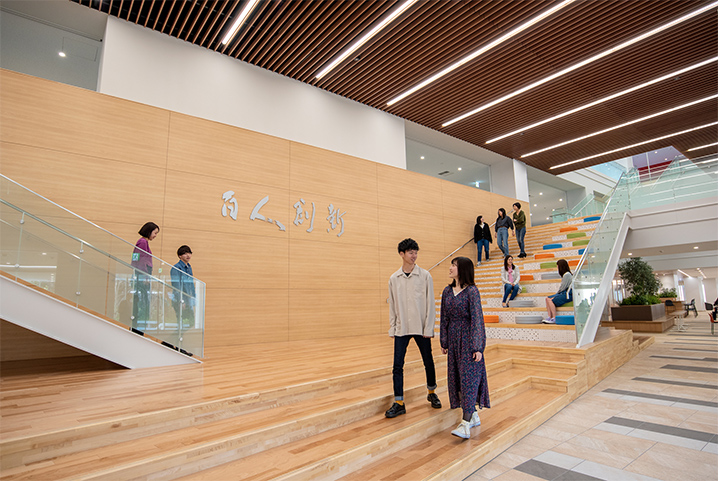 2020年4月、東京都町田市本町田に開設した芸術文化学群の拠点。オープンスペースやラーニングコモンズを各所に配置し、様々な芸術活動が交差するアート空間。2022年には演劇と音楽のスタジオを整備。地域と共生しながら、芸術創造や地域との交流・発信の拠点を目指します。