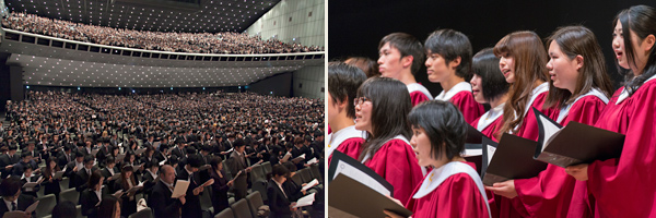 礼拜形式的仪式中新生与圣歌队的同学们一起唱起了赞美歌