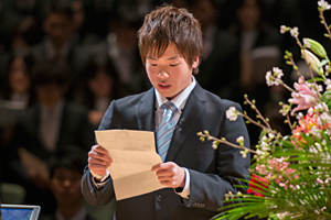 本年度新生为2209名(大学、研究生院、孔子学院合计),在众多的亲朋瞩目中,健康福祉学群的守屋龙介同学代表全体新生登上讲台宣誓入学。
