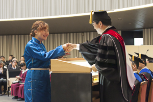 接受学位的有99名本科生、31名硕士生和4名博士生,共计134名。三谷高康校长向学生亲手授予了学位证书。