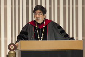 三谷校长在学位授予仪式上,在欢送本届毕业生的致辞中说:“毕业”并非是结束,而是一个新的开始。毕业后的人生,我想不能事事如己所愿,会有痛苦,会有艰辛。即使在这样的时候,一定会有人、或者时间等来自多方面的帮助。樱美林大学的创立者清水安三先生便经常以此来教诲我们——「绝望中希望永在」(《新约圣经•哥林多后书》4章8节)。