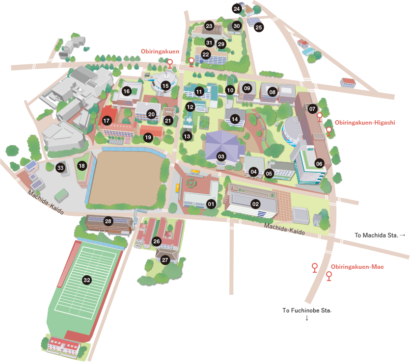 Take a train on the Odakyu Line headed toward Odawara or Hakone-Yumoto. Get off at Machida (about 30 minutes; 370 yen) and transfer to the JR Yokohama Line. Take a local train (not an express) bound for Hachioji and get off at Fuchinobe (about 6 minutes; 160 yen). Take a school bus (Obirin Gakuen bus) from the north exit of Fuchinobe Station to the main campus (8 minutes; free)