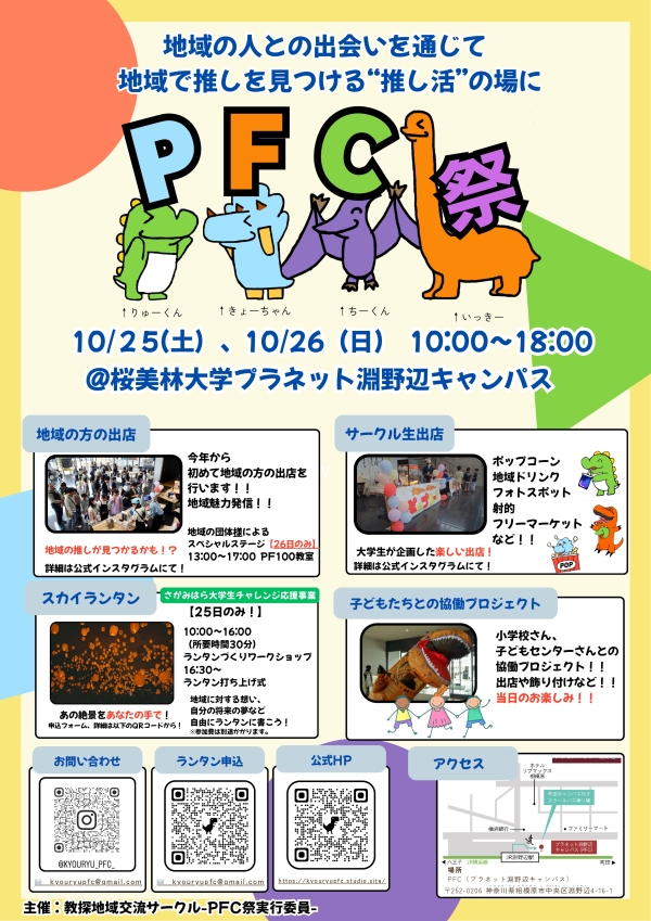 桜美林大学・淵野辺キャンパスにて、今年も「PFC祭(Planet Fuchinobe Campus Festival)」を開催します。
