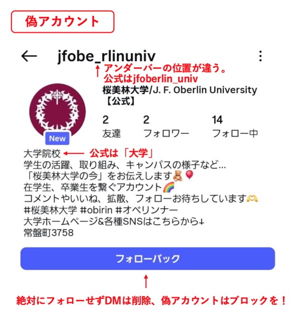 桜美林大学公式Instagramになりすました偽アカウントが確認されました。