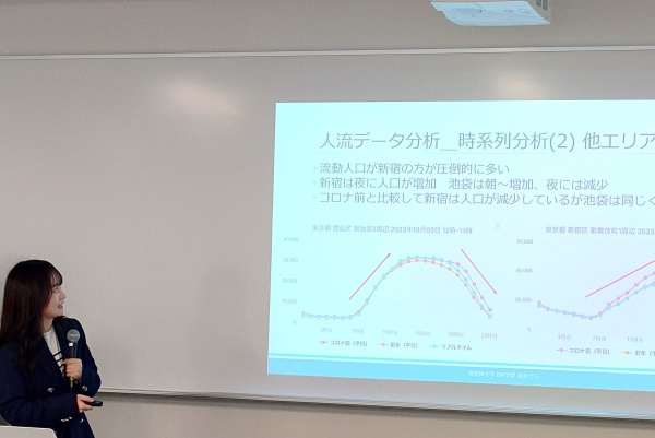 人流データを様々な角度から分析したこと、人流データだけでなく現地調査に行ったことなどを、お褒めいただきました。一方で、データの掘り下げ方に改善余地があることを指摘されるとともに、他エリアとの比較方法や仮説検証方法などの、具体的なアドバイスをしていただきました。こうした厳しくも温かみのあるコメントから、私たち学生も多くのことを学ぶことができました。