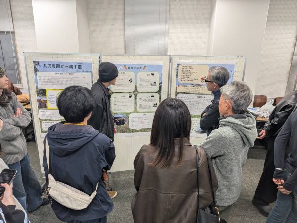当日は8つの農場及び関係団体が参加し、履修生と共に地元野菜の販売等を行いました。多くの学生や教職員がブースに立ち寄り、会場は終始にぎわいを見せ、農場の皆さまと桜美林との交流が広がる貴重な機会となりました。さらに、マルシェ終了後には、ボランティア活動を通して得られた気づきや課題を踏まえ、学生が自身の専門分野を生かして課題解決に向けた提案を行うポスターセッションも実施しました。