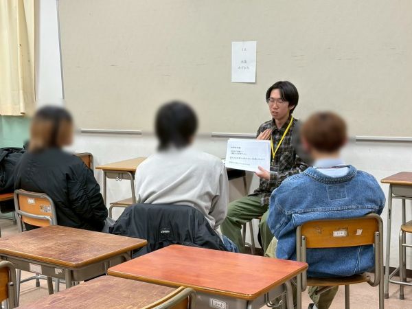 今回のヒューマンライブラリーは、一昨年サービスラーニング科目「地域社会参加(子どもと教育)」を履修し、同定時制高校で活動した健康福祉学群4年の車恭介さんが、履修後も活動を継続したいと立ち上げた学生団体「居場所支援サークルふりくと(フリー+コネクト)」の主催で、サービスラーニングセンターのサポートの下に行われました。
