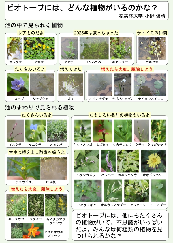 植物(作成:小野瑛晴):「ビオトープの植物図鑑」 をテーマに、絶滅が危惧される「アサザ」などの希少種から、外来種の駆除の必要性、さらには「ヘクソカズラ」といったユニークな名前の植物まで、写真とともに分かりやすく紹介しました。