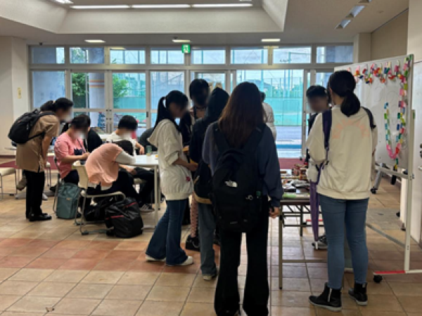 また、2022年度からは、教育探究科学群の林加奈子准教授による授業「地域サービスラーニング(子どもと教育)」の一環として、学生たちが生徒間のコミュニケーションを促進するイベントの企画やヒューマンライブラリーを通した生徒と学生との対話の機会の創出、「定時制祭」の支援など、生徒のニーズに合わせた実践的な教育活動を行ってきました。2023年度からは不登校傾向にある生徒たちの校内居場所づくりを目的とした「フリースペース夜桜ひろば」の実践も始まり、ナナメの関係を活かして学生たちが定時制の生徒たちに寄り添う活動を展開しています。フリースペースでは、町田市社会福祉協議会と連携して定期的にフードドライブ(食品の無料提供)を行い、地域で生徒たちを支える仕組みも作ってきました。