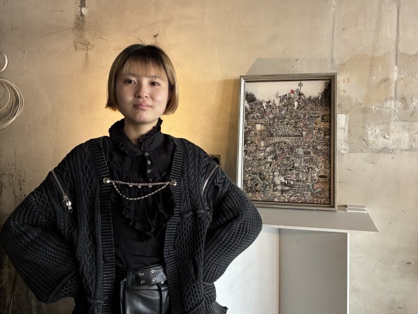 グループ展の代表を務めた松本きらりさん(芸術文化学群ビジュアル・アーツ専修4年)は、「出展場所となる空き店舗を見た時に、コンクリートむき出しの無機質な雰囲気がとても魅力的に感じ、この場所で出展したいとの想いが強くなった。団地Caravanというイベントでしか出逢う事の出来ない人々へ作品を観てもらいたい」と語りました。