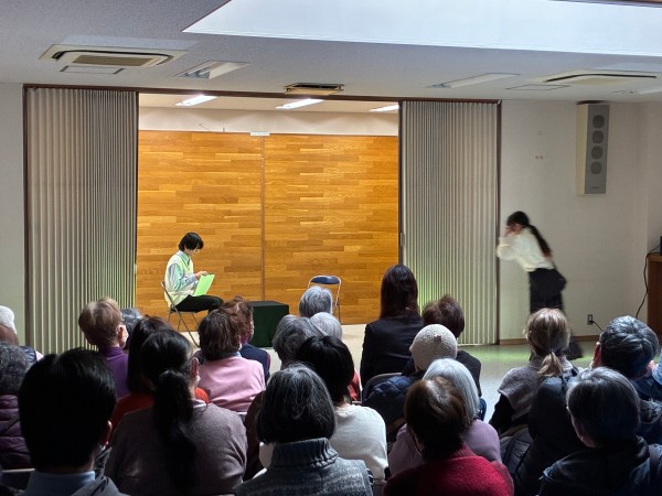 演劇公演企画では、入学時から町田木曽住宅で暮らしてきた高木比呂さん(芸術文化学群演劇専修2年)が代表を務め、創作劇『無音の交響曲』を上演。「JKK東京の方からの提案もあり、町田木曽住宅に住んでいる方々へ演劇に触れる機会を設定したいと思うようになった。私達学生がキャンパスから外に出て、町田木曽住宅に住んでいる方にとって一番身近な集会所である町田木曽会館での演劇公演を企画したら、地域の方への恩返しになるのではないか」との想いから公演を企画。公演当日は事前に用意していた50席が足りなくなるほど、多くの人が町田木曽会館を訪れ、演劇に触れる機会となりました。