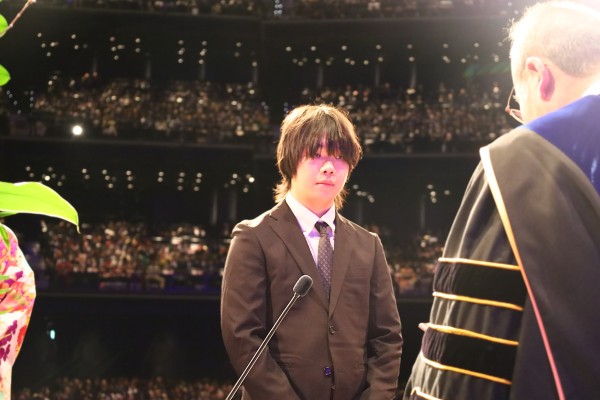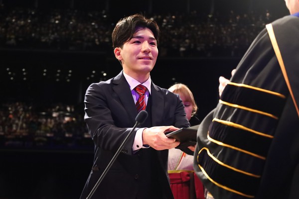 今回の学位授与者は、学士課程2,067名人、修士・博士前期課程69人、博士後期課程4人の合計2,140人。同時に行われた日本言語文化学院(留学生別科)の修了式では、21人に修了証書が授与されました。式中各学群の代表者1人が壇上に上がり、畑山浩昭学長から学位記を受け取りました。学位記は式典終了後、アドバイザー教員から全員に一人ひとり手渡されました。式はキリスト教礼拝形式で進行。クワイヤーの歌声やオーケストラの音色、オルガンの温かい音が式に華を添え、卒業・修了学生は、桜美林大学から新たな一歩を踏み出しました。