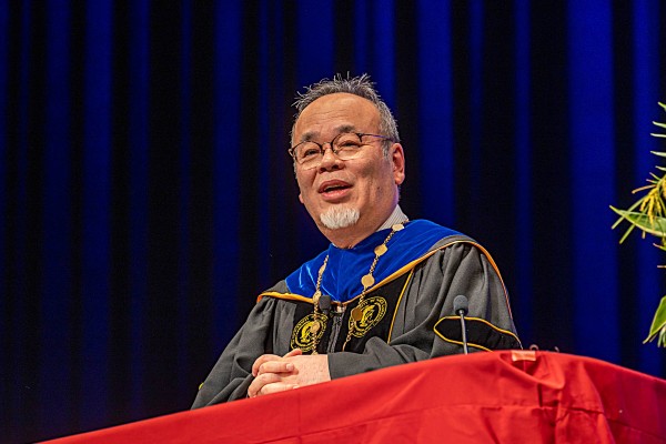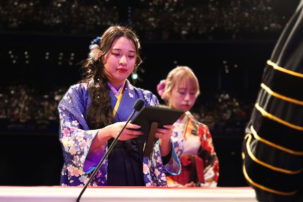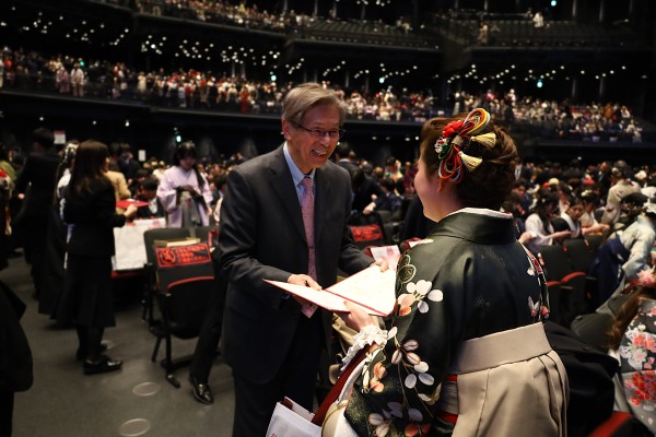 畑山学長は式辞で、「桜美林大学における学びの特長は、一人ひとりの個性・ユニークさを大切にすることを重視しているとともに、その一人ひとりが多様性を尊重し相手を第一に考える姿勢を育むことにあり、それは『自分も人も咲かせる学び』です。