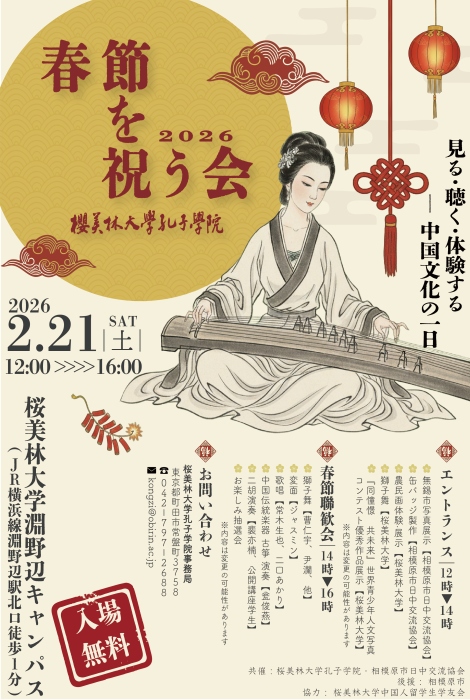 桜美林大学孔子学院 TEL:042-797-2688(平日10:00-16:00、当日は電話が繋がりません)、Mail:kongzi@obirin.ac.jp