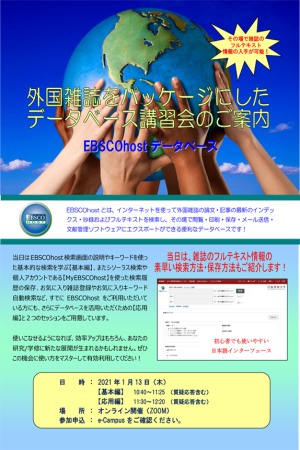 内 容:当日は【基本編】と【応用編】に分けてEBSCOhostの講師の方が解説致します。
