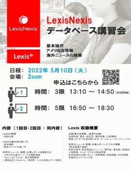 5月10日にLexisNexisデータベース講習会を開催いたします。Zoom開催ですので、どのキャンパスからでも参加できます。