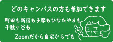 どのキャンパスの方も参加できます。Zoomだから自宅からでも。事前予約不要です。お気軽に参加ください。