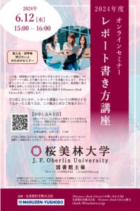 レポート課題の対策講座として、テーマの探し方、調べ方のセミナーを開催します。学生のみなさんがレポート作成に取り組むのに有益な方法を紹介します。課題にレポートが課されて悩んでいる学生の皆様、参加をお待ちしております。オンラインで参加できるので、町田キャンパスだけでなく、新宿、ひなたやま、多摩、PFCの方も参加できます。