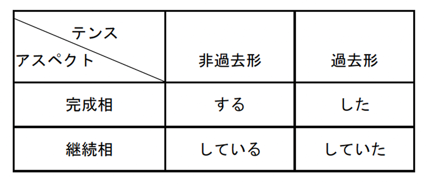 日本語の述語動詞のテンス・アスペクト体系は、日本の言語学者 奥田靖雄が提唱する「奥田アスペクト論」に立脚する先行研究が基盤となっている。これによると、「スル」「シタ」「シテイル」「シテイタ」は、テンス・アスペクトが共有する形態としてフラットな関係に配置されるのが定説だ。