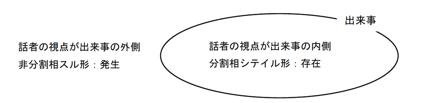 上の図を見てみよう。ここでは話者の視点が、表現対象である出来事の「外側」に置かれる場合は「非分割相スル形」、出来事の「内側」に置かれる場合は「分割相シテイル形」という対立構造になることが説明されている。例えば、「キレイな目をしている」というフレーズ。これは、話者の視点が表現対象の内側にある場合、つまり、「継続」ではなく、「存在」を表現しているといえる。毎日努力して「キレイな目」を継続するのではなく、その人は「キレイな目」を有する存在なのだ。