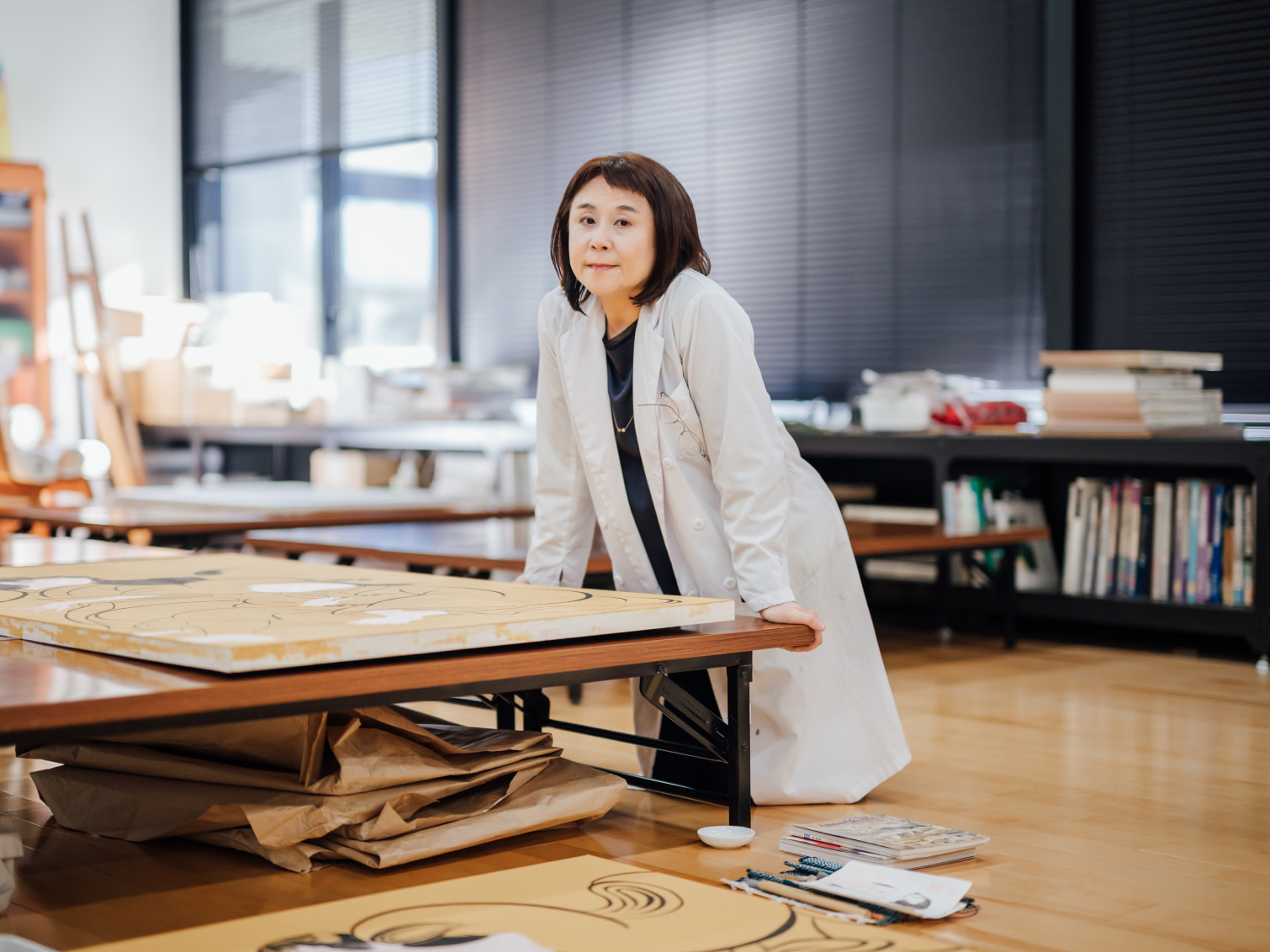 日本画という伝統的な視覚芸術を現代的で時代性を意識して表現し教育しているのが、芸術文化学群の藤崎いづみ教授だ。武蔵野美術大学卒業後、東京藝術大学大学院の博士課程まで進み、日本画の表現技法を極めた。日本画材は「岩絵具(いわえのぐ)」という、天然絵具、新岩絵具など種類と色数が豊かで美しく、粒子の大きさで色の濃さが変化してその質感が魅力的であるらしい。そんな藤崎教授のヒストリーを追っていこう。