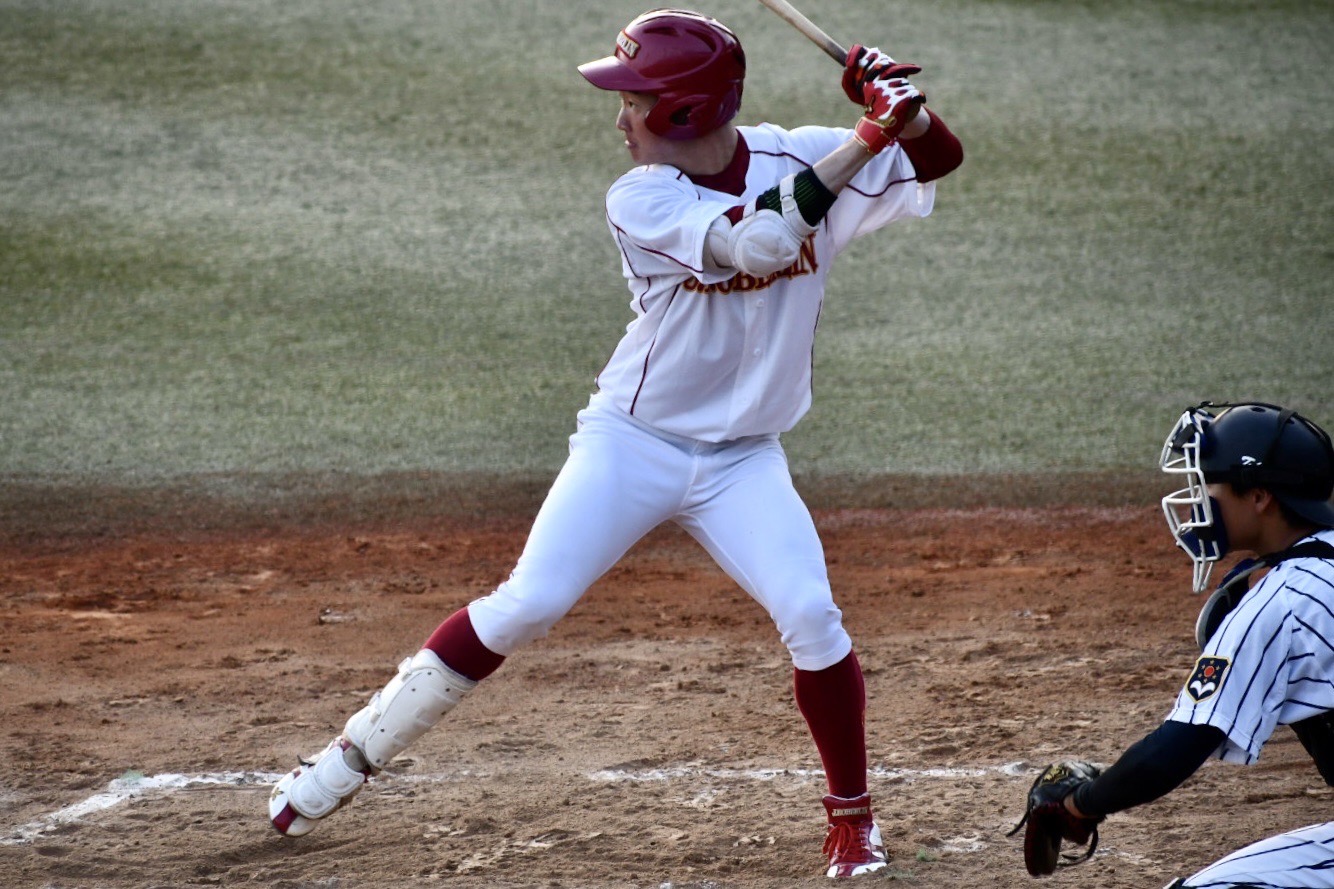 怪我から復帰した1打席目の初球をレフトオーバーに二塁打を放った河原木皇太(健福4年・横浜)