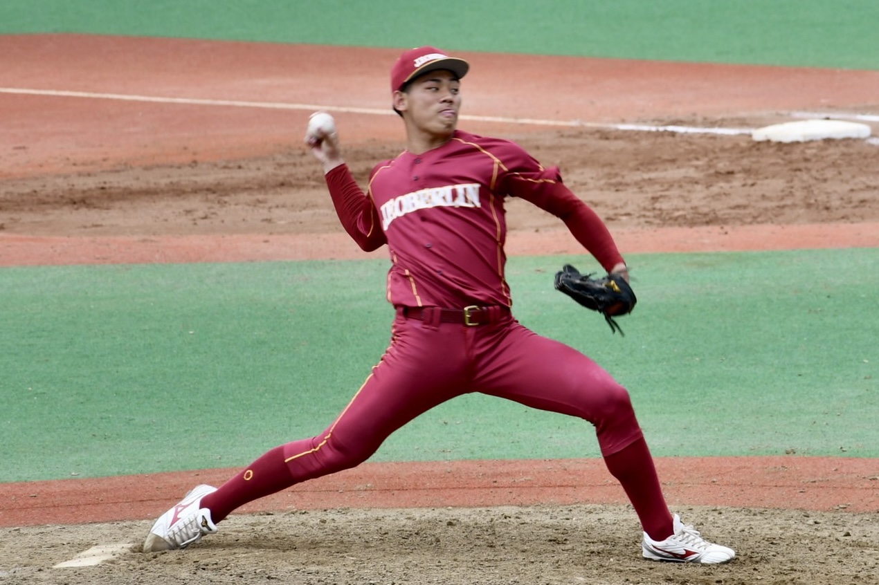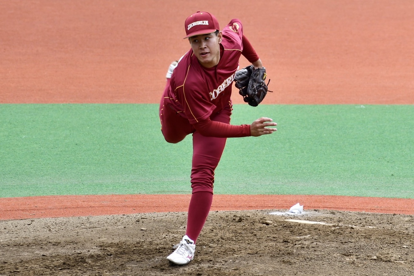 力強いピッチングで先発投手としての役目を果たした山本雅樹(健福4年・中越)