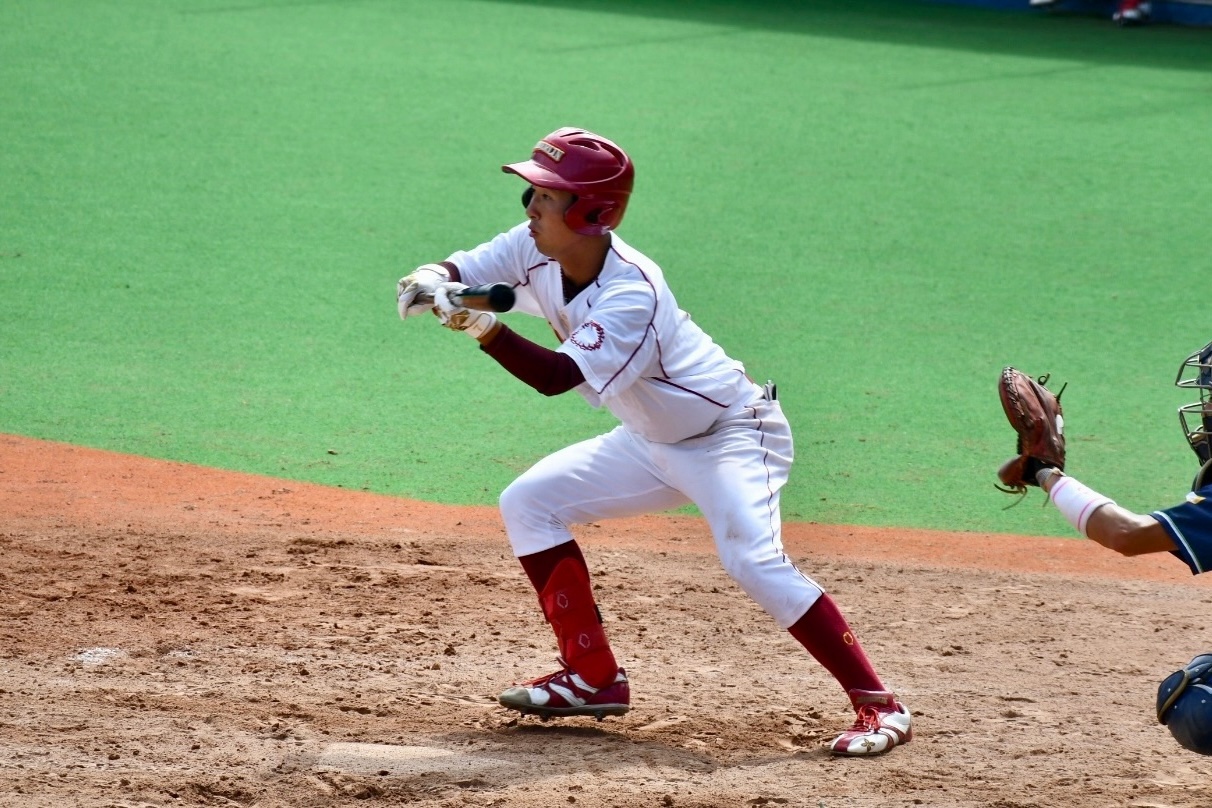 巧みなバットコントロールでの内野安打を含む4安打の大活躍をした森田智貴(健福4年・霞ヶ浦)