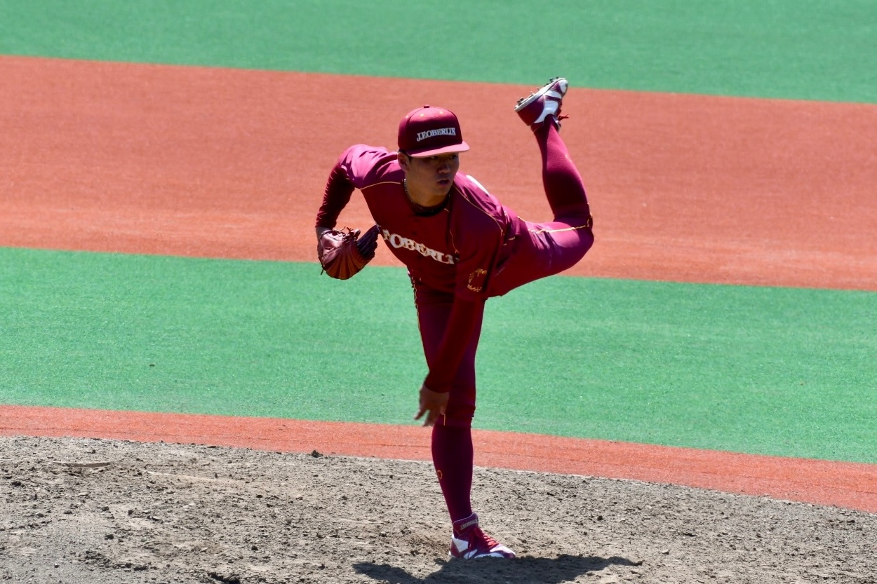 初登板ながら強気のピッチングを見せた西出陽佑(健福2年・東邦)