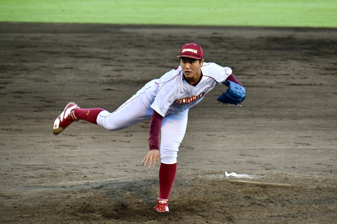 ツーアウト満塁のピンチで登板し、見事0点に抑えるピッチング。次の回も無失点で抑える好投をみせた西有喜(健福4年・東邦)