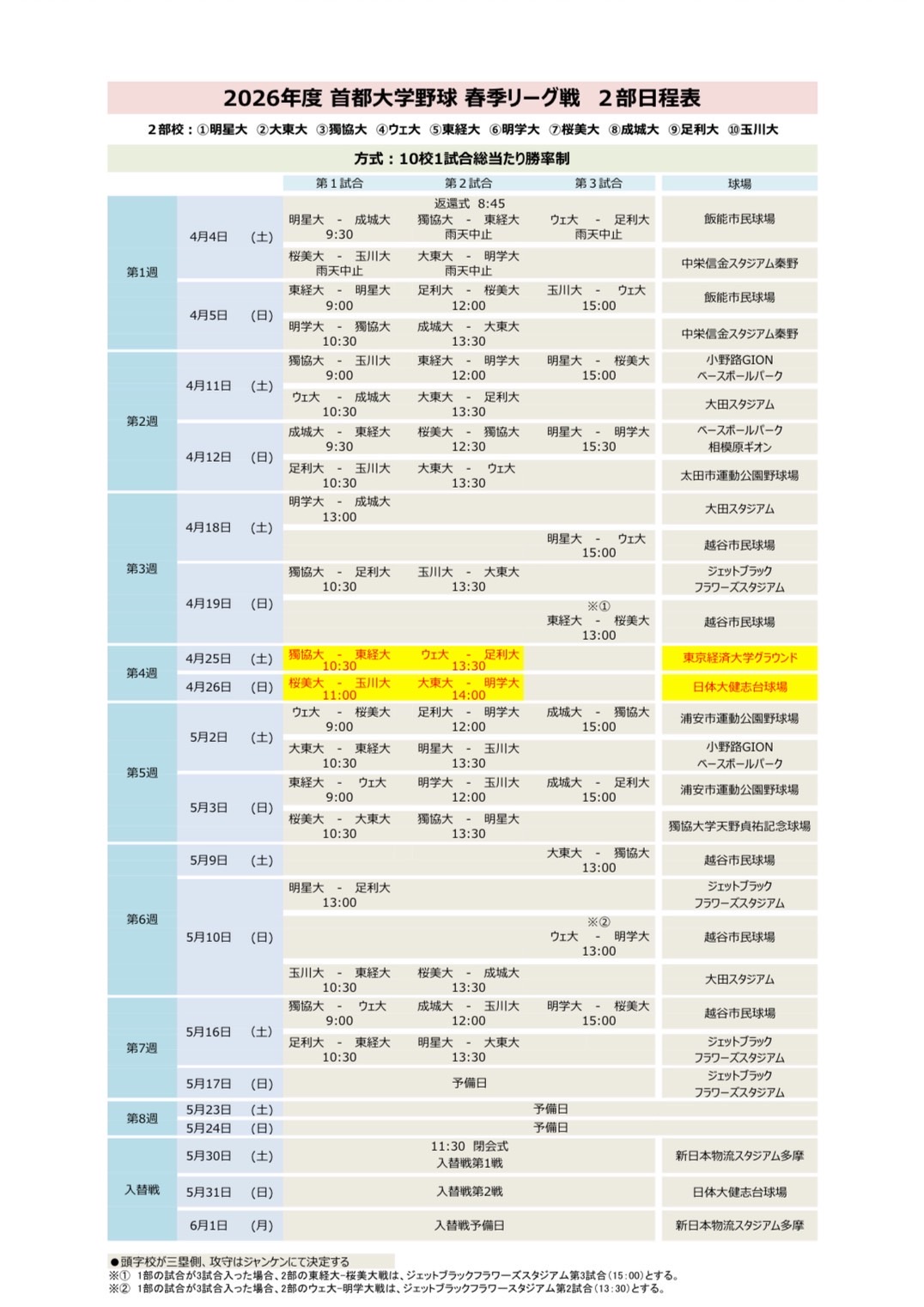 4月4日(土)に天候不良のため中止となりました、玉川大学との試合が以下の通りに変更となります。 4月26日(日) 対 玉川大学 11:00PB 会場:日体大健志台球場 詳しくは、首都大学野球連盟のHPをご覧ください。 引き続き、温かいご声援をよろしくお願いいたします。