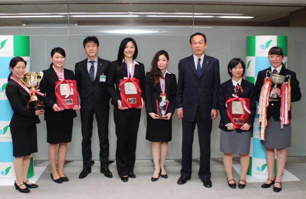 2月22日(水)、6年ぶり5回目の日本一となった弓道部女子(第40回全国大学弓道女子王座決定戦)、世界一となったソングリーディング部(World University Cheerleading Cup Championship2017総合優勝)、アジア大会で優勝したチアリーディング部(第2回ダンススポーツ・アジアン・チアリーディング・チャンピオンシップ優勝)が相模原市の加山俊夫市長を訪問し、優勝報告を行いました。加山市長から「皆さんの活躍が相模原市民に元気を与えてくれています。これからも精進していってください。」と祝福と労いの言葉をいただき、スポーツや芸術分野で優れた成績をおさめた団体などに贈る『称賛の盾』を受け取りました。
